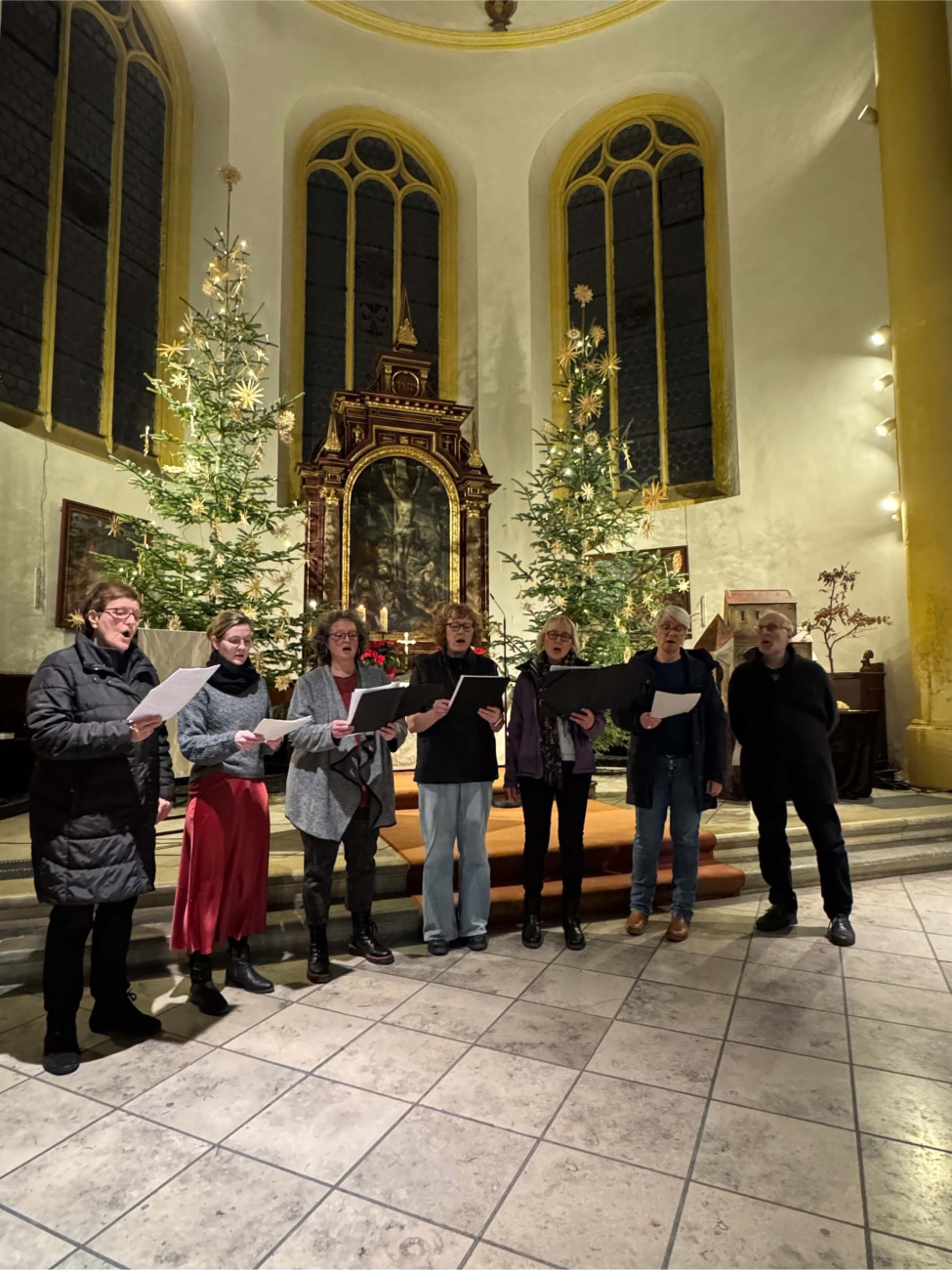 Orgelmusik (an der Orgel: Johanna Klocke) eröffnete und beschloss die Andacht, in der Texte über Flucht, Vertreibung und die Suche nach Heimat von Wiltrud Renter und Sabine Freudenberg vorgetragen wurden. Bonhoeffers letzter erhaltener theologischer Text "Von guten Mächten" (gesungen vom Chörle) wies auf die nahende Jahreswende und das Vertrauen auf die Liebe Gottes auch oder gerade in ungewisser Zukunft.