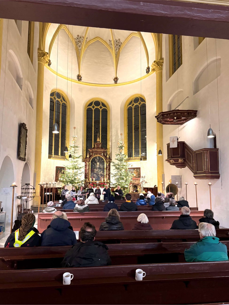 Der besondere Jahresausklang in der Neupfarrkirche – Gemeinsam in den letzten Abend des Jahres starten; schon zum dritten Mal lud das Team um Sabine Freudenberg und Adelheid Bezzel ab 17 Uhr in die Kirche ein. Mit einer heißen Tasse Glühwein oder Tee wurden die zahlreichen Gäste in der wunderbar erleuchteten Kirche begrüßt und das Grammophon von Harald Berghoff zauberte eine besondere Stimmung.
