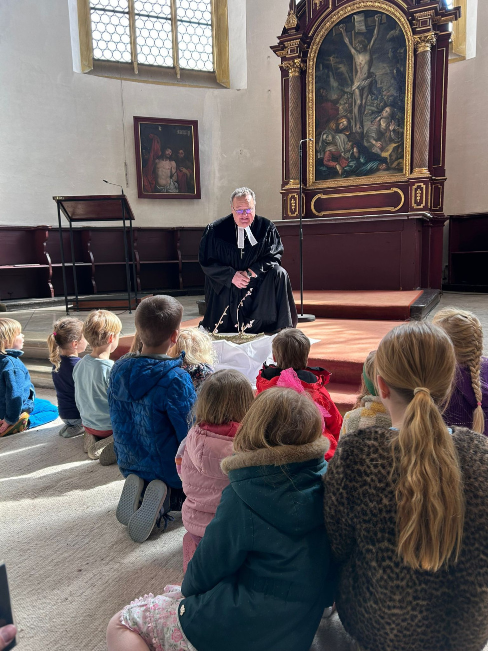 „Alles wird neu“ – dieses Thema zog sich durch den Ostergottesdienst, den Dekan Breu mit Annika Treutler und Adelheid Bezzel gestaltet hat. Aus der karfreitäglichen Kargheit kommend halfen große und kleine Gottesdienstbesucher, den Altar zu decken mit schweren Silberleuchtern, Blumen und Parament, Bibel und Kreuz. Dekan Breu lud die Kinder auf den Teppich vor den Altar, um mit ihm sein Oster-Wunder zu bestaunen: aus einem gefällten Kirschbaumstamm wuchs in den ersten Frühlingswochen neues Leben heran.
