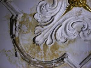 Die Undichtigkeit des Daches hat großflächig Wasserschäden am Stuck hinterlassen. Hässliche Flecken entstanden, einzelne Rippen sind beschädigt, ein Engel im Südosteck des Chorraumes war locker und drohte herabzufallen.