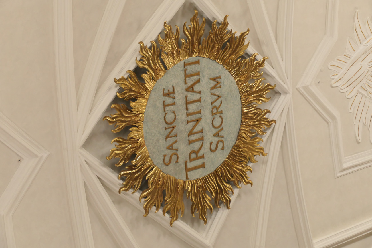 Rosette in Form einer Sonne in der Mitte der Decke der Dreieinigkeitskirche aus Stuck.